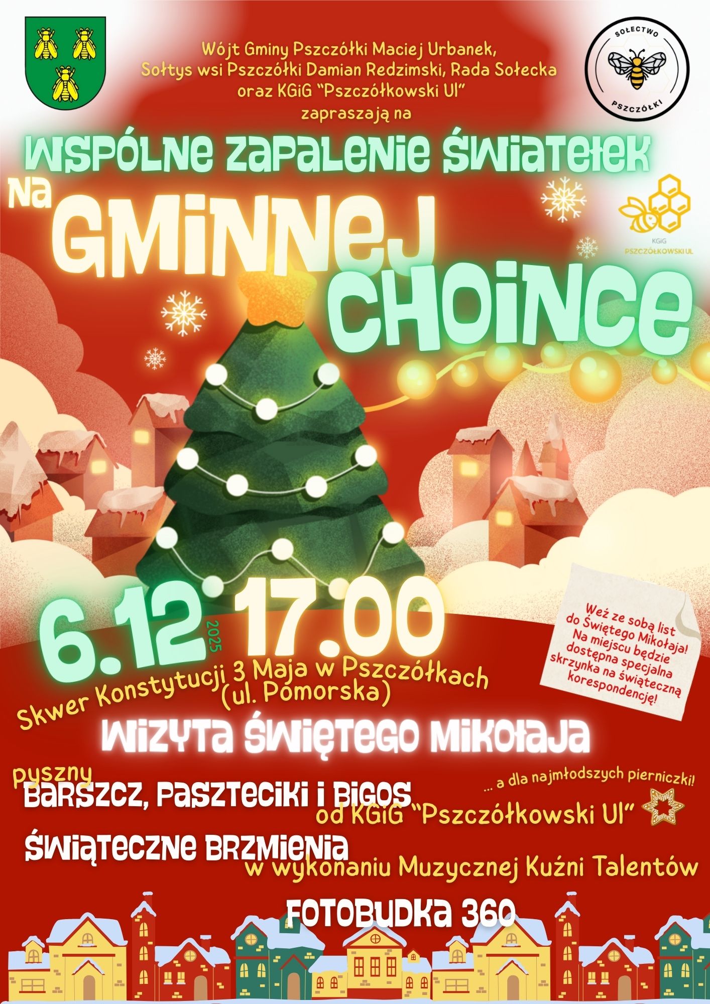 Wójt Gminy Pszczółki Maciej Urbanek, Sołtys wsi Pszczółki Damian Redzimski, Rada Sołecka oraz KGiG „Pszczółkowski Ul” zapraszają na uroczyste rozświetlenie gminnej choinki!